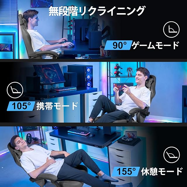 【リクライニング調節+安全なガスシリンダー】:リクライニングは90°から155°まで調節でき、仕事、ゲーム、リラックスをスムーズに切り替えられます。「クラス4」のガスシリンダーにより、座面の高さを自由に調整できるので、体型に合わない心配がありません。