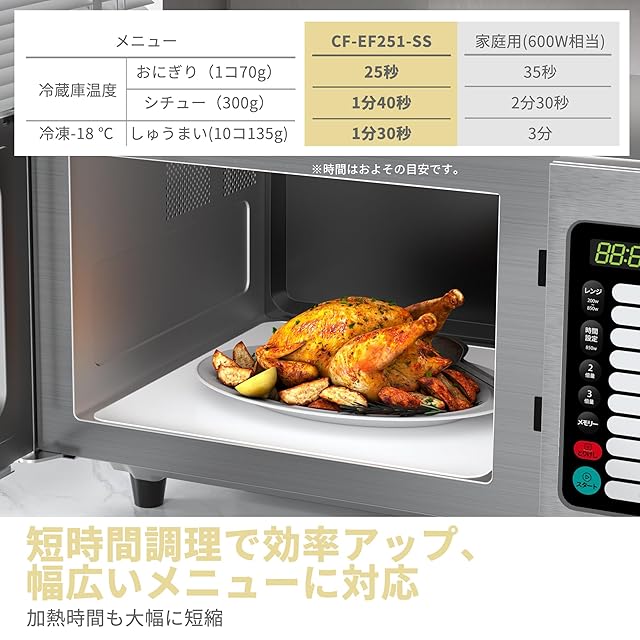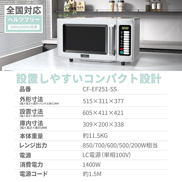 商品名:コンフイー(COMFEE') 業務用 電子レンジ 単機能 23L フラットテーブル ヘルツフリー 単相100V 出力切替5段階 メモリー登録10パターン CF-EF251-SS