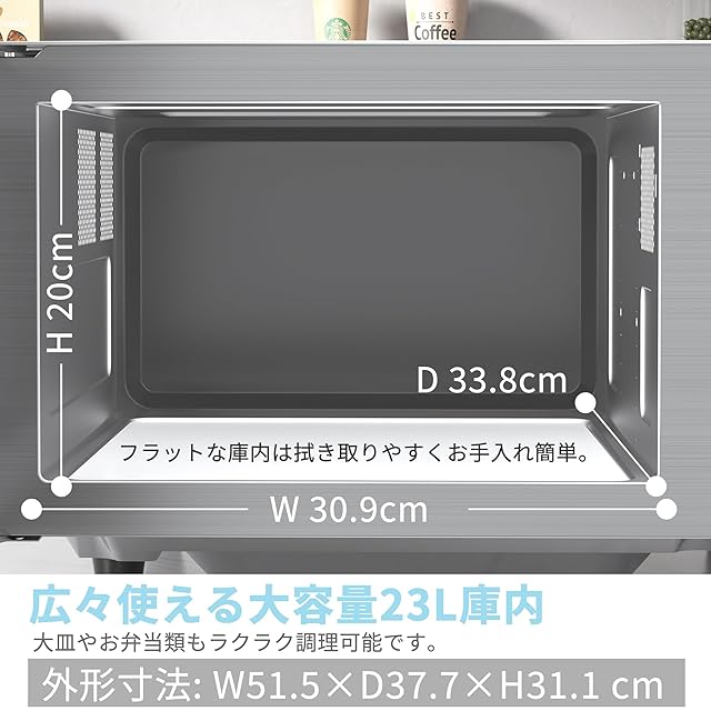 【商品仕様】◇本体サイズ:幅51.5×奥行37.7×高さ31.1cm ◇庫内有効寸法:幅30.9×奥行33.8×高さ20cm ◇ 商品重量:11.5kg ◇定格電圧:AC100V(50/60Hz) ◇消費電力:1400W ◇発振周波数:2450MHz ◇高周波出力:850W/700W/600W/500W/200W相当 ◇電源コードの長さ:1.5m ◇期間:お買い上げ日より2年間
