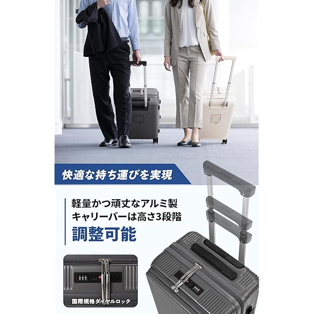 【スーツケース 機内持ち込み・フロントオープンデザイン】フロントオープンのデザインで。タブレット、書籍、携帯電話、チケットなど、荷物に合わせた細かなポケットを用意しており、フロントポケット内の荷物の仕分けもラクラク。また,出張や資料の持ち運びなどビジネス用途から旅行まで、色々な場面で活躍できます。人気が高い前開きのキャリーケースです。