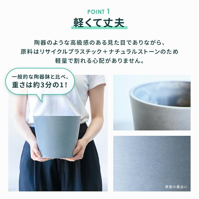【植木鉢のサイズ】■号数:3号■ サイズ 外径: 11.4cm 内径: 10.1cm 高さ: 9.5cm ■ 重さ: 200g ■ 容量: 0.60L■カバー利用:あり■底穴:なし■ 同梱物:鉢カバー