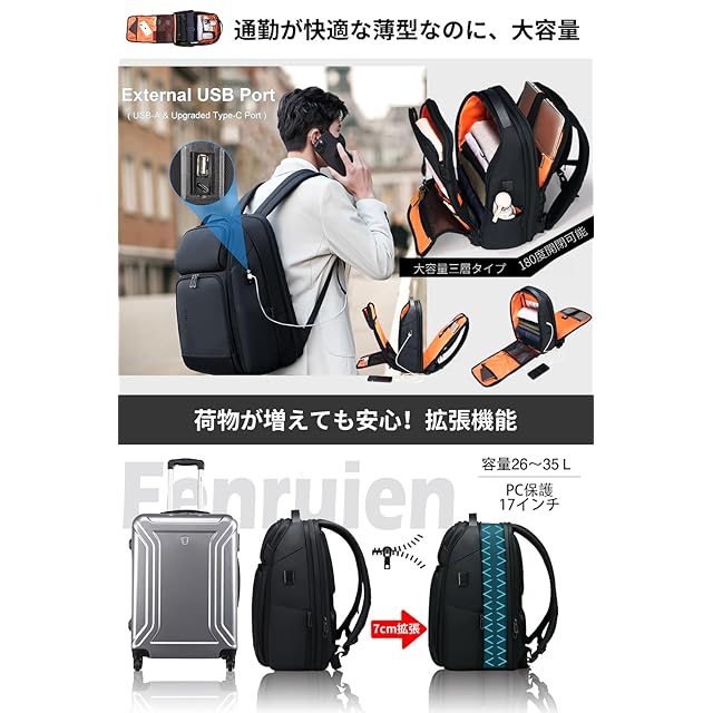 商品名:[FENRUIEN] リュック メンズ ビジネスリュック リュックサック 大容量 PCラップトップバック 防水 17インチ ビジネスバッグ マチ拡張 USB充電ポート 黒 型崩れ防止 通学 通勤 出張