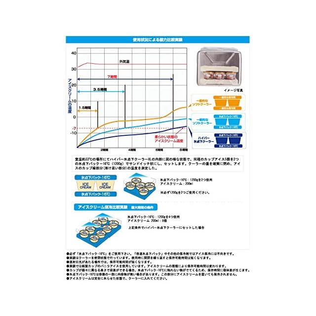●氷点下パックとなら、なんと! アイスクリームを約7時間、条件次第では最大12時間保存できます<br>※当社実験データによる<br>