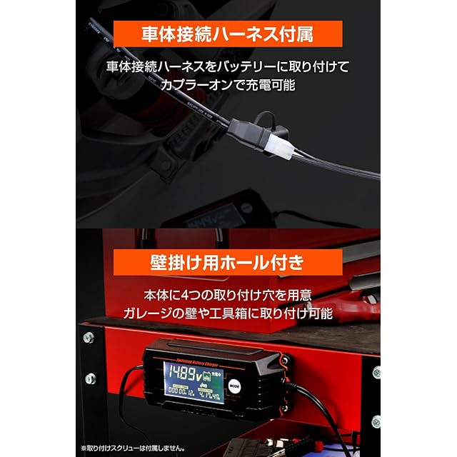 【仕様1】対応バッテリー二輪:2.3~28Ah/四輪:27~80Ah、ベント型/シールド/VRLA/ジェルバッテリー ※リチウムバッテリー使用不可