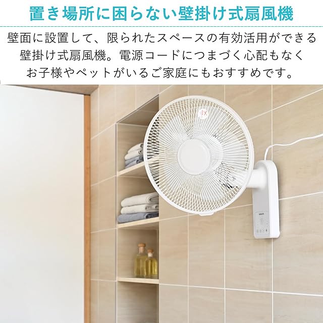 【壁掛け扇風機】壁面に設置して、限られたスペースの有効活用ができる壁掛け扇風機。置き場所に困りがちな脱衣所・洗面所などで活躍します。リモコンが付属しているので、高い場所に設置しても操作は簡単です。