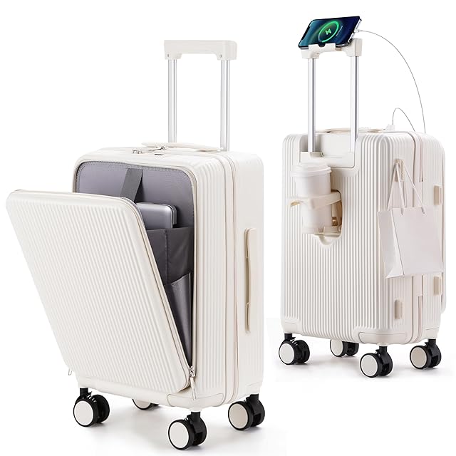 [Mularda] 前開きキャリーケース スーツケース機内持ち込み 耐衝撃 超軽量 USBポート付き Mサイズ 大容量 1-3泊 旅行 ビジネス 出張 ホワイト