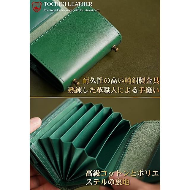 商品名:栃木レザー 二つ折り財布 メンズ 2つ折り 日本製 箱型の小銭入れ ミニ財布 コンパクト 小さい財布 二つ折り 箱状です 牛革 大容量 L字 レディース 蛇腹式カードホルダー (Alite Green Tochigi)