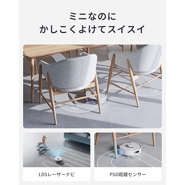 【スマートマッピング & 360°障害物回避】LDSレーザーSLAMを採用し、複雑な間取りのお部屋でも高精度なマップを構築。家具が多くても、散らかっていても、ダイニングテーブルやイスの脚が乱立する、「家具の脚の森」もスムーズに走行します。落下防止センサーで、玄関や階段などの段差から落ちる心配もいりません。侵入禁止エリアやバーチャルウォールもアプリから簡単に設定。